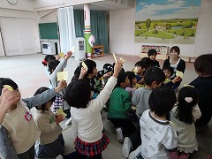 白沢保育所の3歳児クラスのお友だちといっしょに、劇団「なるにあ」さんの人形劇「ものいうなべ」「王子様の耳はロバの耳」を鑑賞しました。 人形劇を鑑賞後、和田幼稚園の4歳児クラスで、一緒に遊びました。