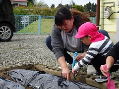 外では、一緒に遊んだり、花壇にチューリップの球根を植えたりしました。