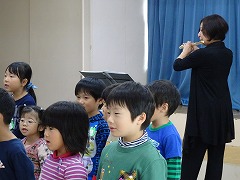 フルートコンサートの最後は、由紀先生のフルートに合わせて、「切手のないおくりもの」を歌いました。「息の合ったフルートと子どもたちの歌に、涙が出そうになりました。」という感想をいただきました。「本物に触れる感動」を、これからも大切にしていきたいと思います。
