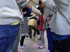 最後はみんなで身体を動かして、たっぷり遊びました。ふくろうのすみかでは、「三匹のこぶた」ごっことなって、「こんな家ふうふうのふ~で吹き飛ばしてやる!」の、やりとりと追いかけっこを楽しみました。