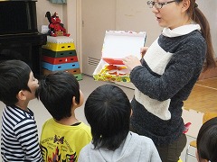 年長組さんは中村先生に、昨年からわらべうたや詩、絵本を読んでいただいて