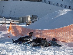 疲れたら、雪の上に寝転んで一休み! カメラを向けていても、雪合戦の的になりました。
