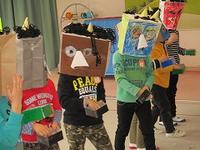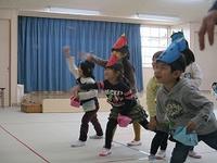 自分たちで作ったお面をかぶり、的に向かって豆をまきました。